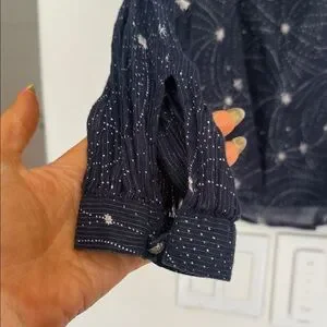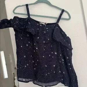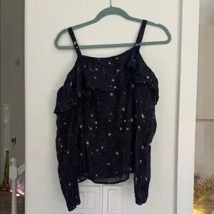 Navy off the shoulder blouse with allover star print. Cold-shoulder ruffle detail and straps. Lightweight, flowy fabric for easy layering. Feminine and versatile for day or night.