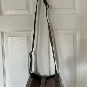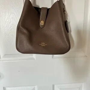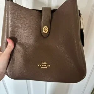 Coach shoulder bag in chocolate brown pebbled leather. Adjustable strap and top tab closure. Gold-tone hardware and logo plaque. Clean, structured silhouette for everyday wear.