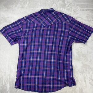 Wrangler men's short sleeve plaid western snap shirt in purple and blue tones.
