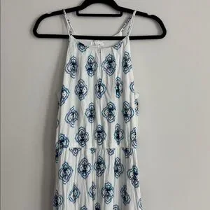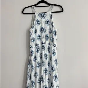 Elegant maxi dress with intricate blue patterns. Features a flowing silhouette. Perfect for casual or dressy occasions.