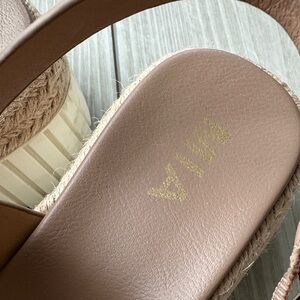 Chic MIA espadrille sandals with wide straps and ankle buckle. Cushioned footbed for comfort. Rope-wrapped platform for a relaxed look. Easy to pair with casual outfits.