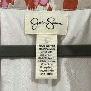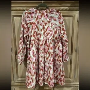 Chic dress with pink, white, and tan pattern. Long sleeves and stylish tiered design.