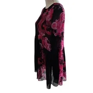 Beautiful Free People boho tunic mini dress featuring a striking pink and magenta baroque floral print on black. This lightweight textured chiffon dress has a flowy empire waist silhouette with dramatic bell sleeves and a low scoop back with adjustable tie for a romantic, bohemian look.