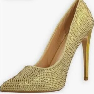 Elegant gold heels with sparkling rhinestones. Perfect for any occasion. New in Box! Size 10 with a five inch stiletto heel. Some missing rhinestones but hidden well- see pictures.