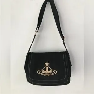 Design: It is a black canvas shoulder bag featuring a large gold-toned Vivienne Westwood Orb logo and white contrast stitching.