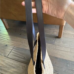 Stylish Yves Saint Laurent tote crafted from natural straw. Features elegant dark leather straps. Perfect for versatile use.