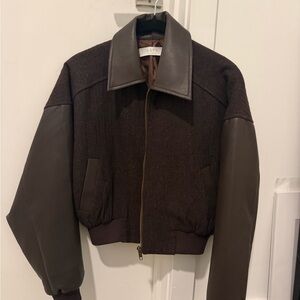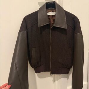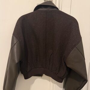Size XS. Like new no signs of wear. Stylish brown bomber jacket featuring leather sleeves. Perfect for a chic and edgy look.