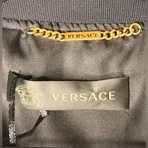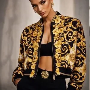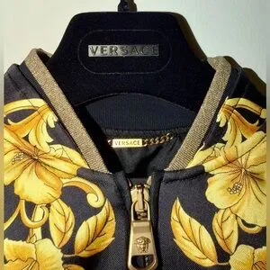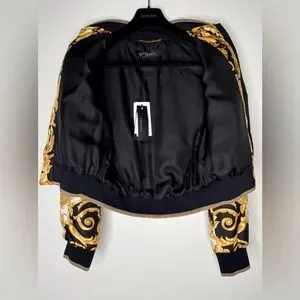 Luxurious Versace bomber with bold gold baroque motifs on black.