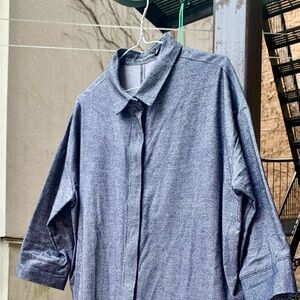 Minimalist textured shirt dress / long tunic by Montréal designer François Beauregard. Clean architectural silhouette with hidden placket, cuffed sleeves and side pockets. Beautiful micro-textured weave in 100% cotton. Versatile piece that can be worn as a shirt dress, tunic or lightweight layering jacket.