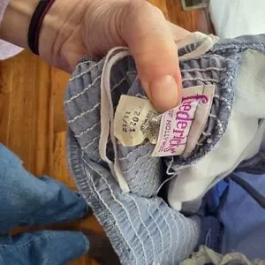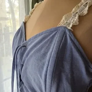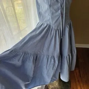 Crafted from 100% cotton denim, the dress features a flattering lace-up corset-style bodice and charming white lace straps. The tiered skirt adds a playful, flirty silhouette. It's in very good vintage condition, showing minimal signs of wear for its age.