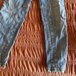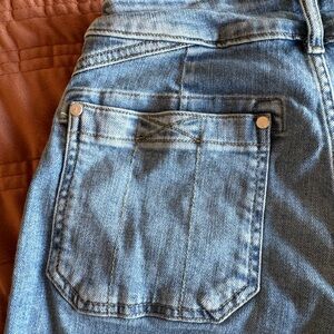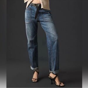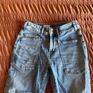 The PILCRO Women's Size 25. The Wanderer Mid-Rise Relaxed Jeans by Anthropologie are a stylish and comfortable option for women. These jeans feature a button closure, 5-pocket design, and a relaxed tit, making them pertect tor everyday wear. Made trom a cotton bleno denim fabric, these jeans are easy to care for and suitable for all seasons. The solid blue color and straight style add a versatile touch to any wardrobe, while the high rise waist provides a flattering silhouette. Perfect for a casual yet put-together look.