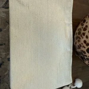 Elegant cream cosmetic pouch. Shiraleah gold logo on interior. Soft woven texture. Zip closure with tassel accent.