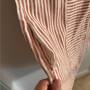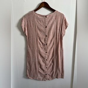 Chic mini dress with salmon pink and white stripes. Perfect for casual outings. Comfortable and stylish. Linen Blend.
