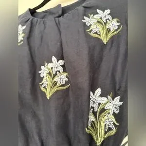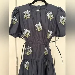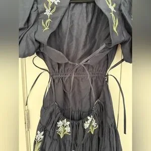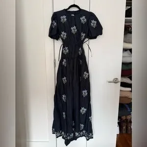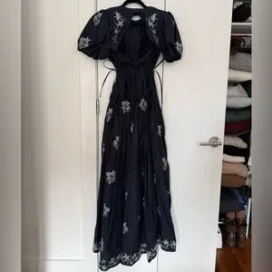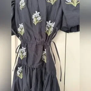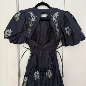 DESCRIPTION: *Authentic* Agua by Agua Bendita Samba Maxi Linen Dress in Navy with machine embroidery floral detail. Design details include a flattering puff detail that provides just the right coverage, front cinch detail showcasing the most flatting part of your waist (with really cute and dainty bow ties for added femininity), and the back is a bit exposed with a lovely tie detail as well. This stress is stunning and perfect for guest-of occasions or just perfect for the summer ! Itās completely linen and feels high quality and artisanal. Wore once, so basically new !