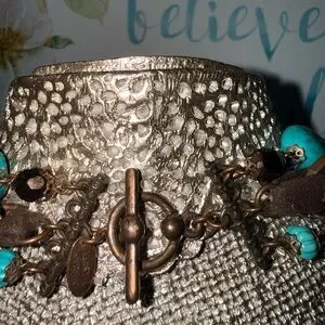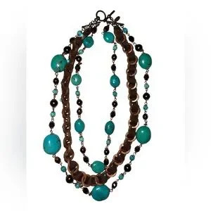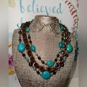 Elegant turquoise and brown beaded necklace perfect for adding a pop of color to any outfit. Features a unique design with a blend of turquoise and brown beads.