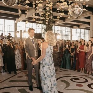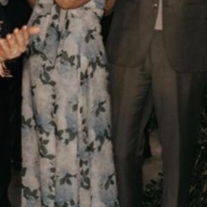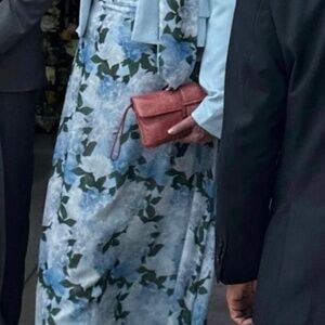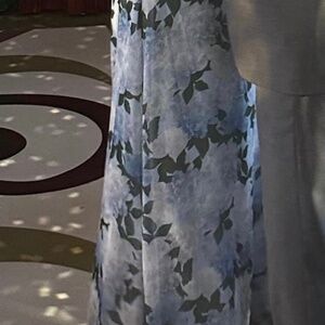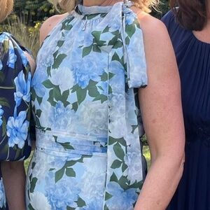 I purchased this gorgeous Sachin and Babi gown for my son’s wedding. Wearing it was a delight, lightweight and graceful. Gentle halter cut is flattering for shoulders.It has been worn once and carefully laundered. There are no tears or damage. Side zipper. Elegant bow on the left side of the dress adds a beautiful flutter when moving. It is a size 10, I did not adjust the hem as it was perfect for my 5 foot seven height with slight heels. I did however, have it taken in slightly in the waist. It’s probably closer to a size 8 now. I am providing a stock photograph as well of a number of photos from the wedding to show it on a size 8-10 woman. It’s a beautiful dress, was incredibly comfortable for the 12 hour event and eight hours of dancing. I paired it with a pale blue Steve Madden cropped jacket to cover my shoulders for the ceremony. Navy shoes. The dress retails for $325.