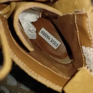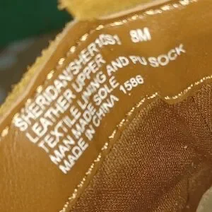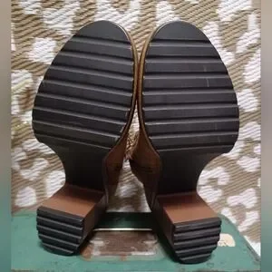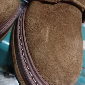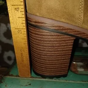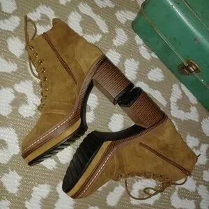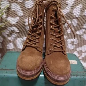 Only worn indoors for a brief minute and managed to catch the heel on the toe. See last photo. Otherwise, these are new without tags. Side zippers, so you set laces and leave them alone. Genuine suede uppers and faux wood heels.