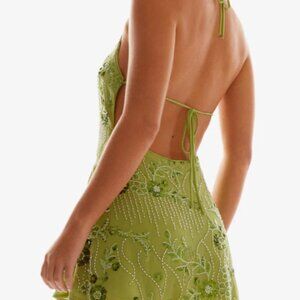 Featuring a halterneck silhouette and glistening beaded fabric, this green mini radiates club-ready energy and unforgettable allure.