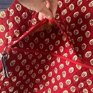 Vintage Vera Bradley garment bag with a zipper compartments. Opens up and has ribbons for securely tying clothing within. Folds and has handles for or convenient carrying and hanging. It is in very good condition with just minor signs of use.