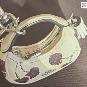 Coach mini wristlet with cream leather. Burgundy cherry print accents. Gold-tone hardware and tassel charm. Small, stylish accessory for keys or essentials.