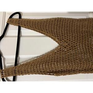 Brown crochet swim cover-up dress with fringe detailing. Features a deep V-neck and sleeveless design. Perfect for beachwear or festival looks. Lightweight and breathable knit fabric. Stylish and versatile addition to summer wardrobe.