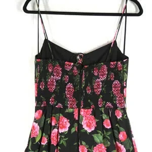 Sweetheart neckline; adjustable self-ties Fixed spaghetti straps Hem falls below the knee A-line silhouette Center back zip Linlinednon adjustable strapsrose printsmocked backlace up front necklinehook and eye and zipper closure at backmid weight fabricdry clean97% cotton 3% elastaneing: Polyester Dry clean ImportedShipping and returns
