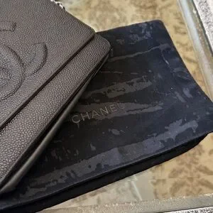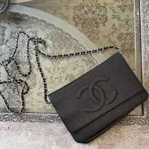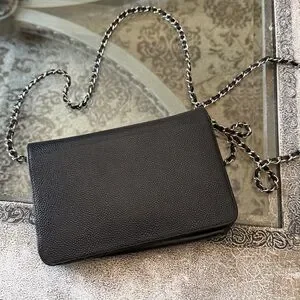 Chanel black caviar leather wallet on chain. Elegant stitched CC logo and versatile chain strap. Smooth pebble texture with secure flap closure. Perfect for day-to-night wear and effortless styling.