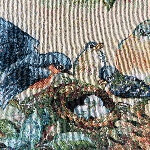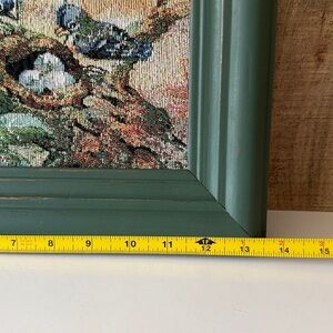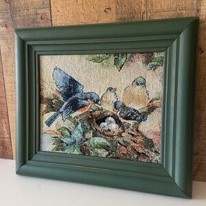 Beautiful embroidery art featuring birds in a green frame. Perfect for home decor. Frame was painted and slightly distressed, then sealed with oil wax. Has hanging hardware. No glass.