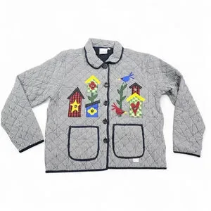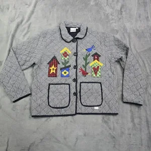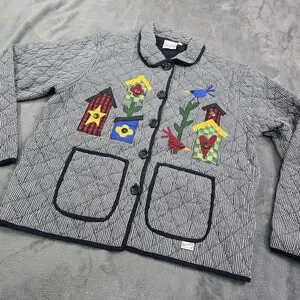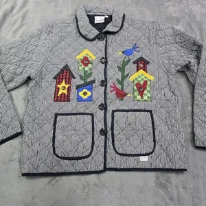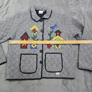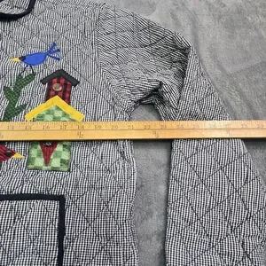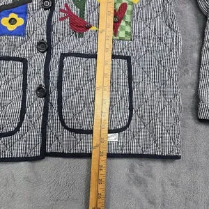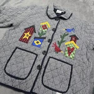Vintage Folk Art Quilted Jacket Birdhouse Applique Gingham Large