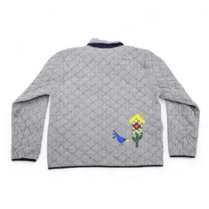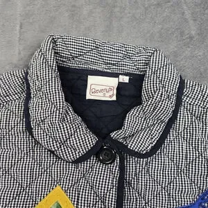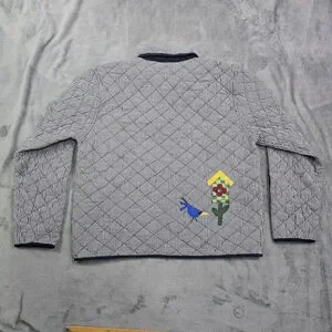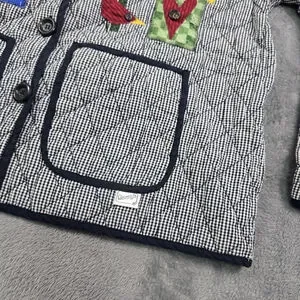 Vintage quilted folk art jacket with birdhouse appliqué in navy and white gingham. This charming cottage-style piece has a button-front closure, two front patch pockets, and contrast navy trim throughout. The quilted construction gives it light structure while keeping it comfortable for layering.