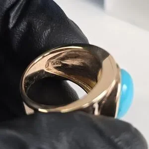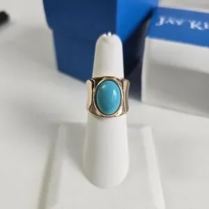 Description: This Jay King sterling silver rose gold plated Sleeping Beauty turquoise ring is a true marvel of artistry and elegance. The vibrant blue Sleeping Beauty turquoise cabochon, renowned for its flawless clarity and stunning hue, is the star of this piece, evoking the serene skies of the Southwest. Nestled within a robust sterling silver setting, the band is luxuriously plated with warm rose gold, creating a striking contrast that enhances the gemstone’s natural beauty.
