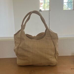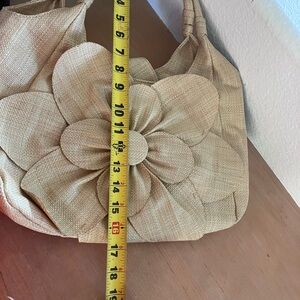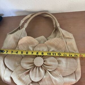 Stylish beige woven tote featuring a dramatic floral front accent. Lightweight and chic for everyday use. Neutral beige complements many outfits.