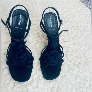 Elegant Miu Miu black strappy sandals with decorative floral accents. Smooth black leather straps and a secure ankle buckle. Sophisticated design perfect for dressy occasions. Lightweight and refined for evening wear.