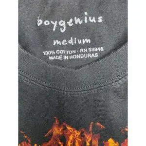 Boygenius World Tour 2023 graphic t-shirt captures the high-energy indie rock aesthetic with a bold flame-engulfed band portrait on the front and a comprehensive list of global tour dates on the back. Crafted from comfortable 100% cotton, this black short-sleeve tee features the band's name in a stylized heavy metal-inspired font, making it a standout piece for fans of Julien Baker, Phoebe Bridgers, and Lucy Dacus. The classic crew neck and standard fit ensure a versatile look that pairs easily with denim or layered under a flannel for a complete concert-ready outfit.