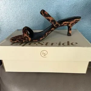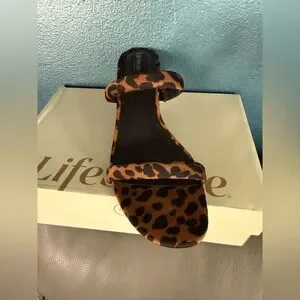 leopard print strappy kitten heel sandals in brown and black. Sleek two-strap design for easy on-and-off wear. Comfortable low heel for all-day style. Eye-catching leopard pattern to elevate outfits.