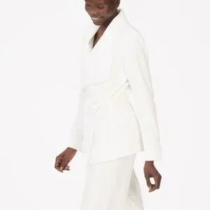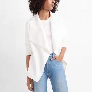 Club Monaco Cadee Jacket in white. A cascading shawl collar softens a lightweight layer while an elastic band at the back gives it shape and form. Take your pick: Can be worn open, or a tie detail at the waist offers another option.