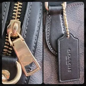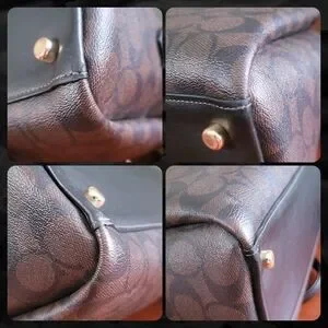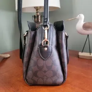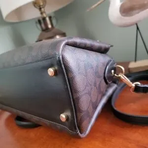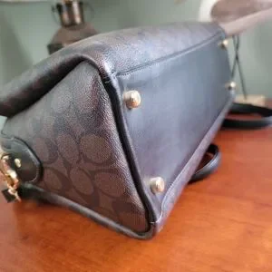 Coach CH488 Darcie Carryall Black Brown Signature Canvas Leather Satchel Bag is Coach style number CH488, made in 2022. The exterior is made of smooth black leather and coated canvas in Coach's signature C pattern in the popular chestnut/brown and black pattern. Gold-tone hardware. Dual leather handles and a fully removable longer strap that is adjustable for shoulder or crossbody wear. There's are 4 feet on the bottom of the bag to protect from wear.