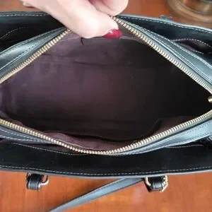 The interior of the bag is brown canvas and has 3 compartments: