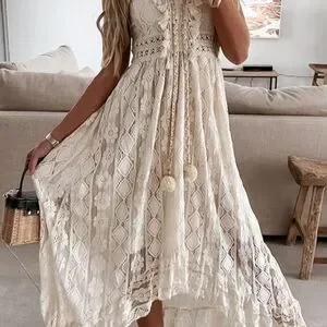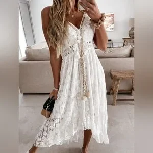 This elegant white lace maxi dress is perfect for any occasion. Its intricate lace design adds a touch of sophistication and style. Ideal for summer events or a casual day out.