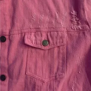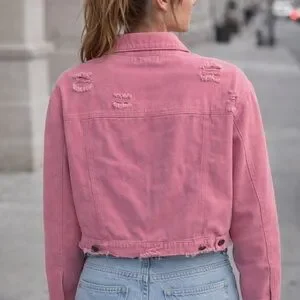 Stylish pink cropped denim jacket featuring a trendy distressed design. This eye-catching jacket has a modern streetwear look with frayed details and a raw hem, making it perfect for casual outfits, festivals, or layering with everyday looks.
