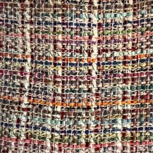 Structured short sleeve tweed top in a woven multi-color pattern. Clean round neckline and subtle fringe trim. Polished style that layers well.