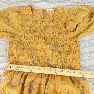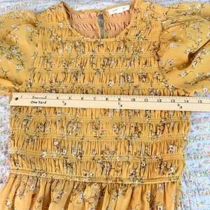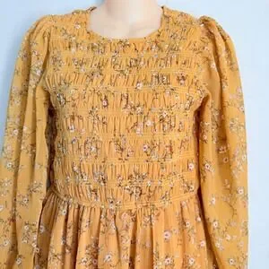 August Sky Mustard Yellow Floral Smocked Tiered Midi Dress Small Long Sleeve