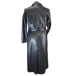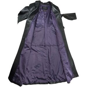 Wilsons Leather Pelle Studio long trench coat in black features a premium leather outershell with Thinsulate Ultra insulation for added warmth. This sophisticated outerwear piece includes a button-front closure, a matching waist tie belt to define the silhouette, and a notched lapel collar. The interior is fully lined in a contrasting purple fabric and includes a removable zip-out liner, making it versatile for changing temperatures.