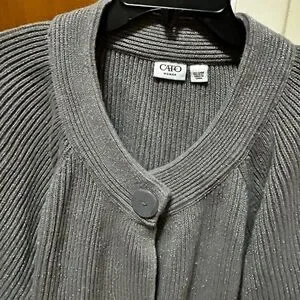 Sparkling gray ribbed cardigan by Cato. Single large button at the V-neck closure. Subtle metallic thread throughout. Relaxed fit for easy layering. Soft knit with gentle stretch.