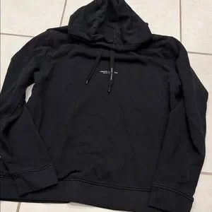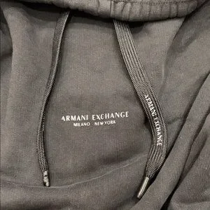 Armani Exchange pullover hoodie in solid black. Features a small centered chest logo. Drawstring hood and ribbed cuffs. Simple, modern silhouette for everyday wear.