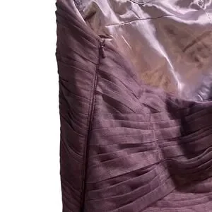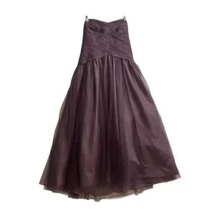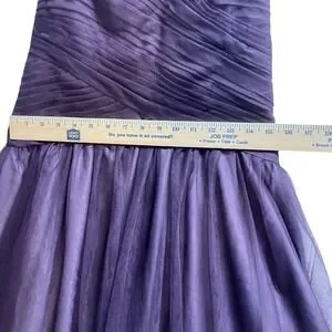 Monique Lhuillier Bridesmaids strapless gown features a sophisticated criss-cross pleated bodice and a draping chiffon skirt. The rich plum purple hue and floor-length silhouette create a romantic, ethereal look perfect for formal events, weddings, proms, or galas. Designed with a structured interior including a waist stay and side zipper for a secure, flattering fit.