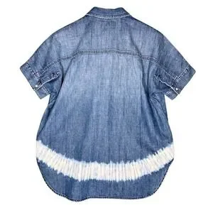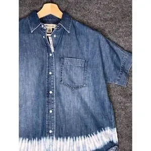 Embrace a relaxed, artistic vibe with this Madewell denim button-down shirt, featuring a unique tie-dye bleach effect across the hem. Crafted from soft 100% cotton, this short-sleeve top offers a comfortable oversized fit with a classic pointed collar and a single chest pocket. The high-low curved hem adds a modern touch to the timeless indigo wash, making it a versatile piece for effortless styling. This item is brand new with tags and in pristine condition.