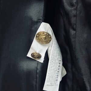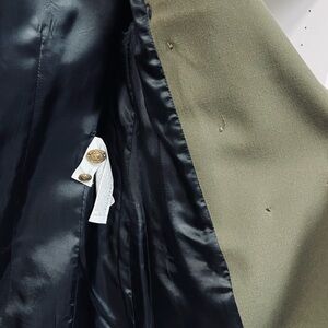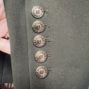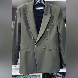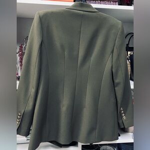 Stylish olive green blazer. Features gold buttons. Perfect for formal occasions.