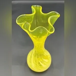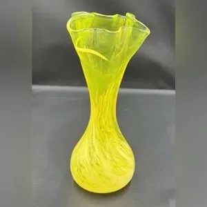Vintage MCM Yellow Hand Blown Art Glass Vase Swirled Swung Ruffled Rim 7.5”T