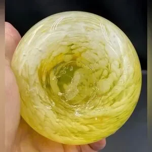 This vintage Mid Century Modern yellow hand-blown glass vase features a solid pattern with white accents at the bottom. Standing at 7.5" tall, the vase is handmade with a ruffled rim and a swirled design in a vibrant yellow color. The Murano-style glassmaking technique adds a unique touch to this abstract art piece, making it a standout decorative collectible from the 1960s. Excellent condition. Excellent condition. No chips or cracks. There is a rough spot on the bottom.